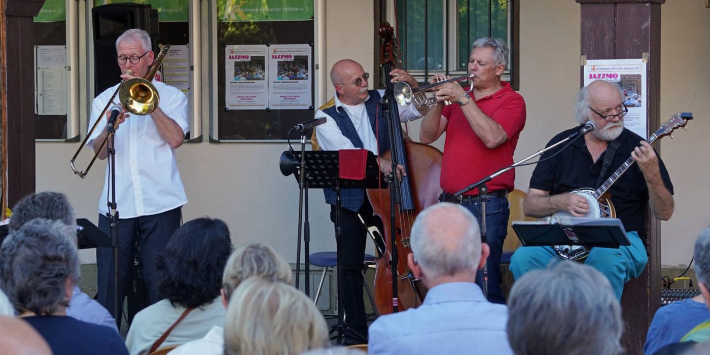Wie jeden Sommer gastiert die JAZZMO-Band unter den Arkaden des Uhlbacher Rathauses mit Blues und Jazz-Oldies der „Roaring Twenties“, mit Stücken aus der Swing Ära und vielen bekannten Titeln des Jazz Revivals der 50er und 60er Jahre. JAZZMO spielt den traditionellen New Orleans Jazz. Starke Kollektiv-Chorusse, jazzige Vocals, fetzige Improvisationen, eine launig gesprochene Moderation und vor allem mitreißende Spielfreude sind die herausragenden Eigenschaften der Band. Sie werden entspannt und zufrieden nach Hause gehen und sich freuen wieder dabei gewesen zu sein, als der Mississippi nach Uhlbach kam.